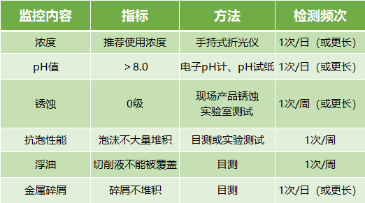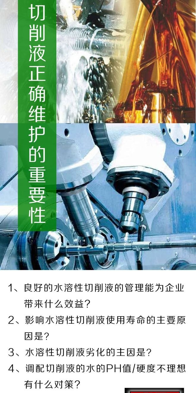 對沒有異味、使用正常的機床進行維護,將切削液上的浮油、切屑及其他雜物徹底清理干凈,將加入原液使切削液濃度在正常使用濃度基礎上提高 4-6個點的濃度,并按照工作液體積0.1%的比例加入殺菌劑,循環(huán)均勻。